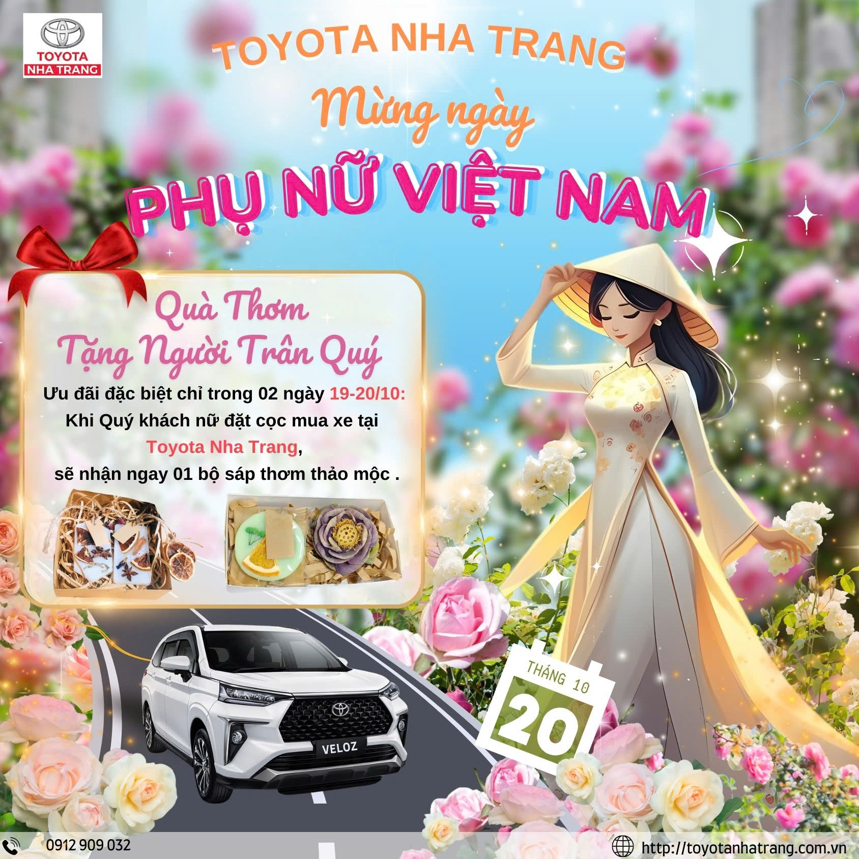 Ưu đãi đặc biệt chỉ trong hai ngày 19-20/10: Khi Quý khách nữ đặt cọc mua xe tại Toyota Nha Trang, sẽ nhận ngay bộ sáp thơm thảo mộc – món quà thay cho lời chúc "Rạng rỡ ngàn hoa, tỏa hương hạnh phúc” của chúng tôi. Đây là món quà gửi gắm sự quan tâm, cùng lời chúc phái đẹp luôn ngọt ngào và an nhiên.