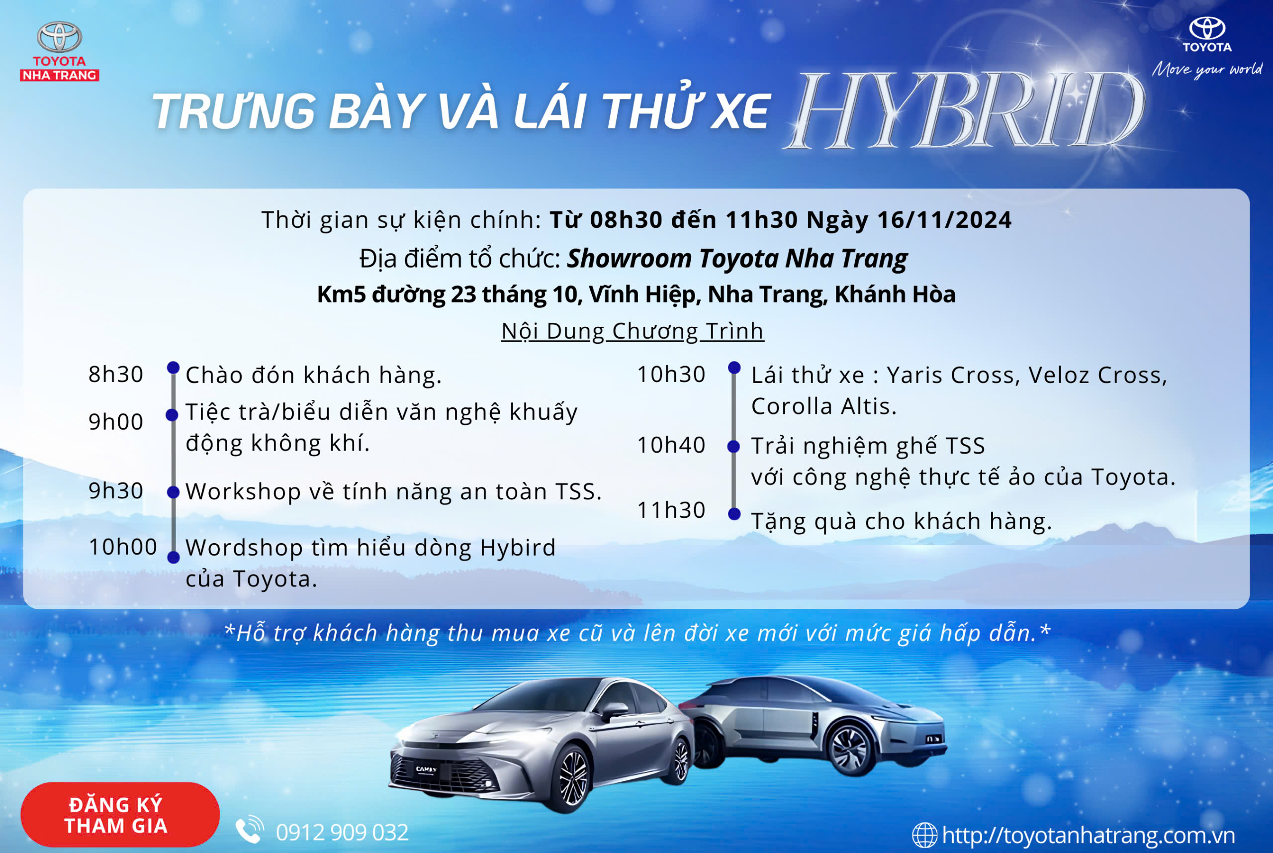 - Workshop Hệ thống An toàn Toyota (TSS) – Khám phá những công nghệ an toàn tiên tiến, đảm bảo mỗi hành trình đều an toàn và thoải mái.- Workshop giới thiệu công nghệ Hybrid – Hãy cùng chúng tôi tìm hiểu sức mạnh và sự tiết kiệm vượt trội của dòng xe Hybrid, sự lựa chọn hoàn hảo cho môi trường.