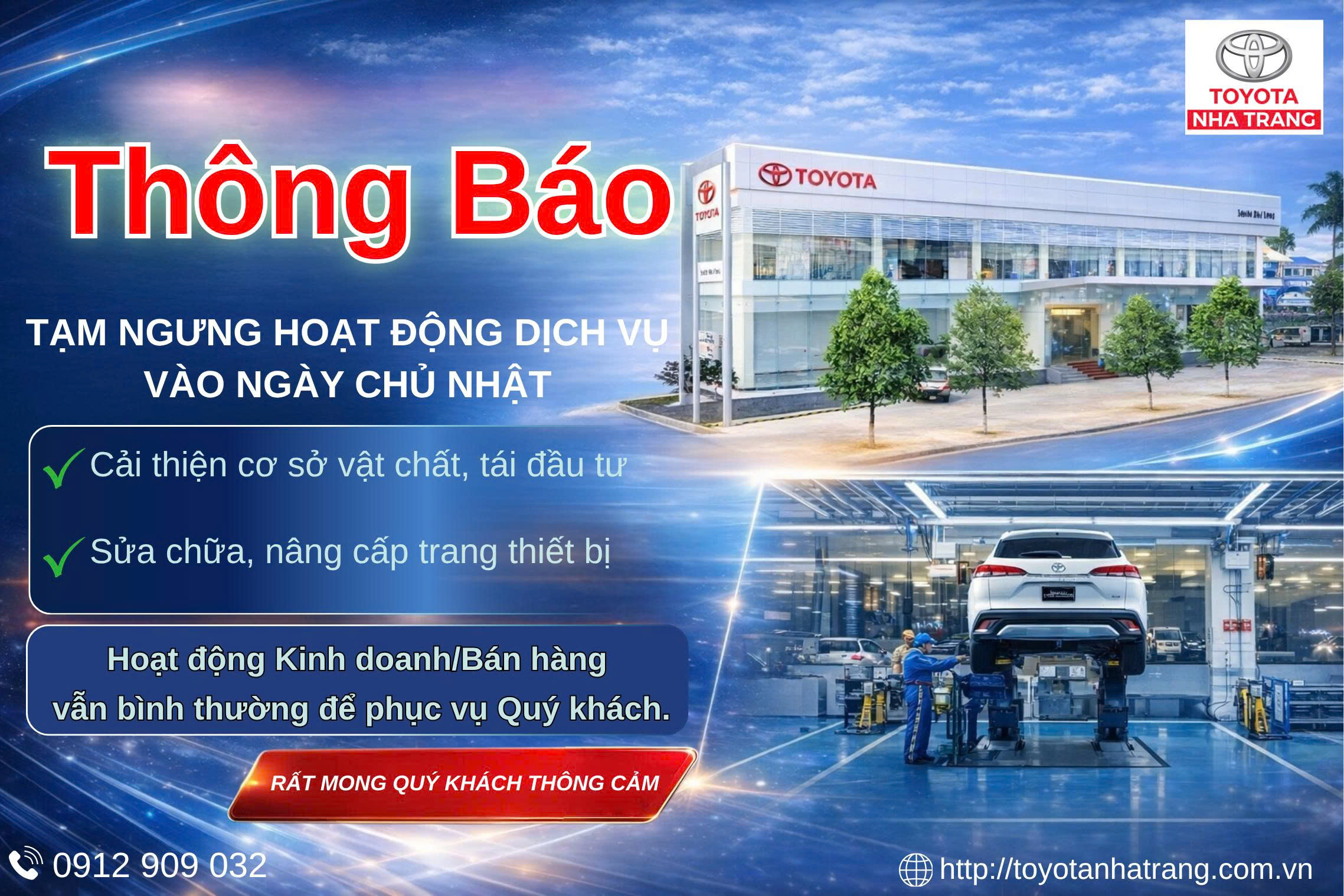 Công ty Cổ phần Toyota Nha Trang xin trân trọng thông báo đến Quý khách hàng lịch nghỉ hoạt động nội bộ nhằm phục vụ công tác sắp xếp nội bộ, cụ thể như sau: