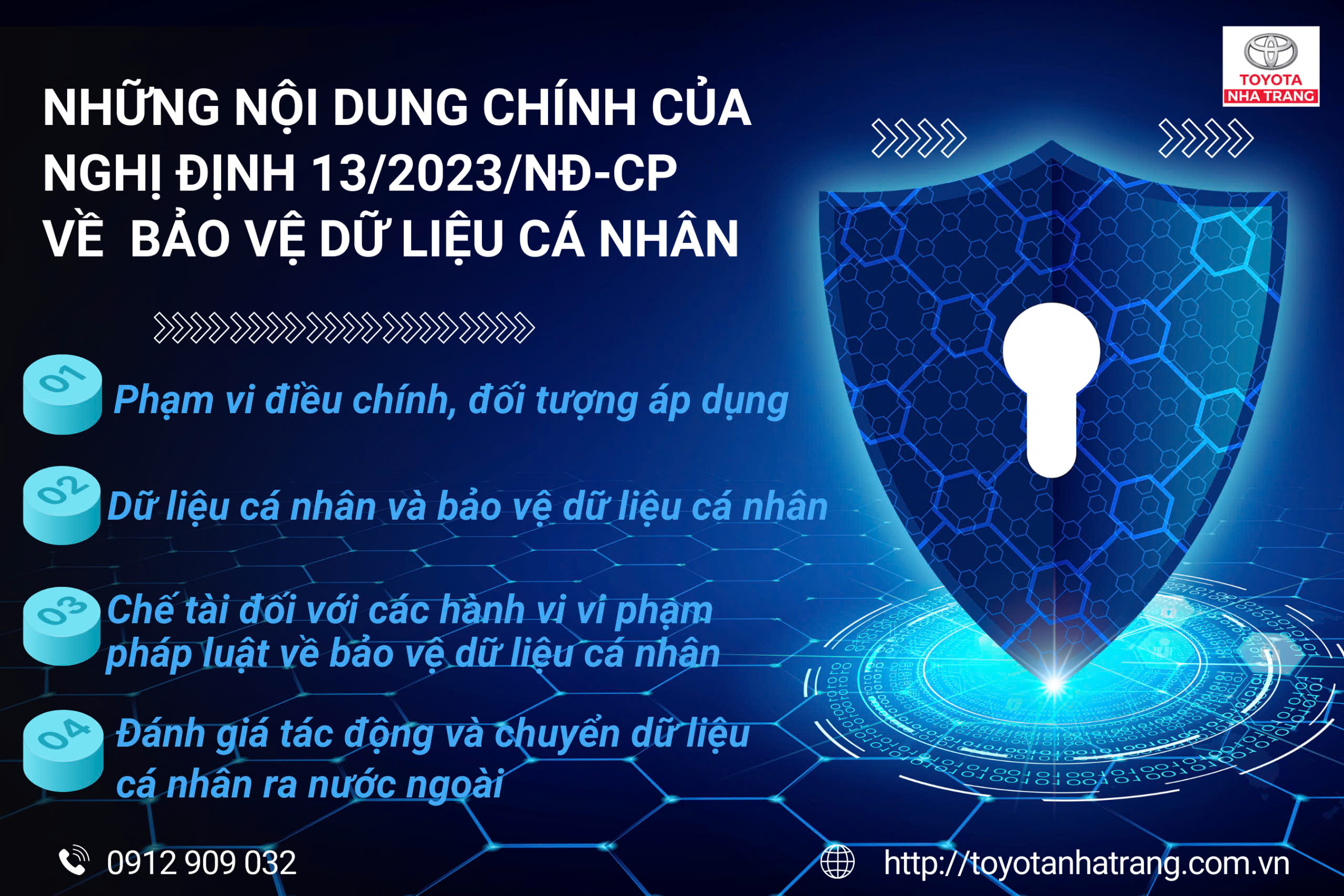 Toyota Nha Trang luôn đặt sự an toàn thông tin của khách hàng lên hàng đầu. Theo Nghị định 13/2023/NĐ-CP về bảo vệ dữ liệu cá nhân, mọi tổ chức và cá nhân có trách nhiệm: