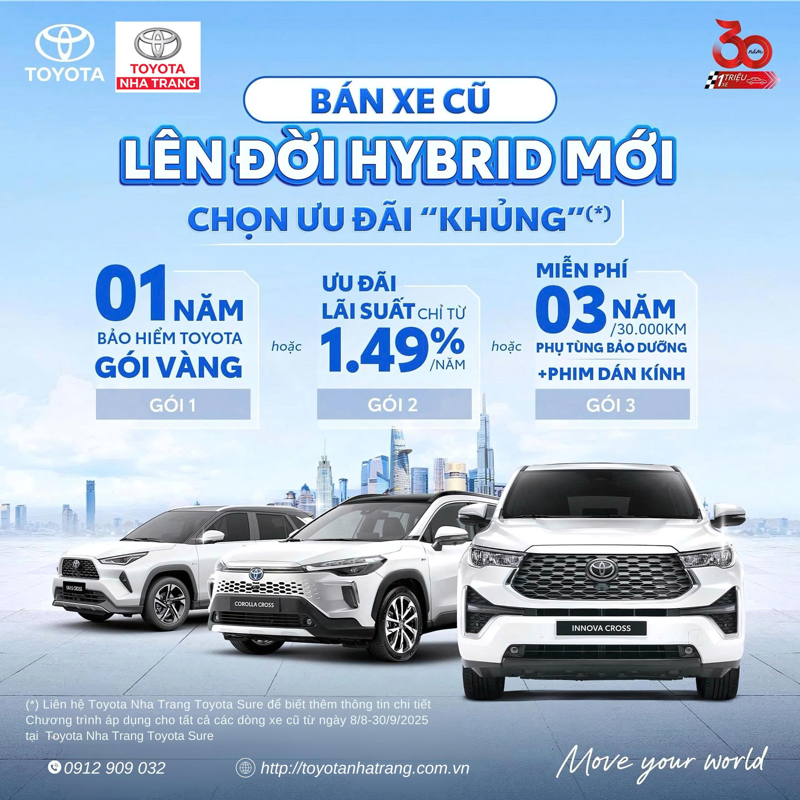 Tháng 8 này, Toyota Việt Nam mang đến cơ hội hấp dẫn dành cho khách hàng muốn nâng cấp xe với chương trình bán xe cũ (không phân biệt dòng xe) và mua mới các mẫu xe Yaris Cross HEV, Corolla Cross HEV, Innova Cross HEV. Sở hữu xe mới trong tầm tay và nhận ngay 1 trong 3 ưu đãi dành riêng cho chương trình: