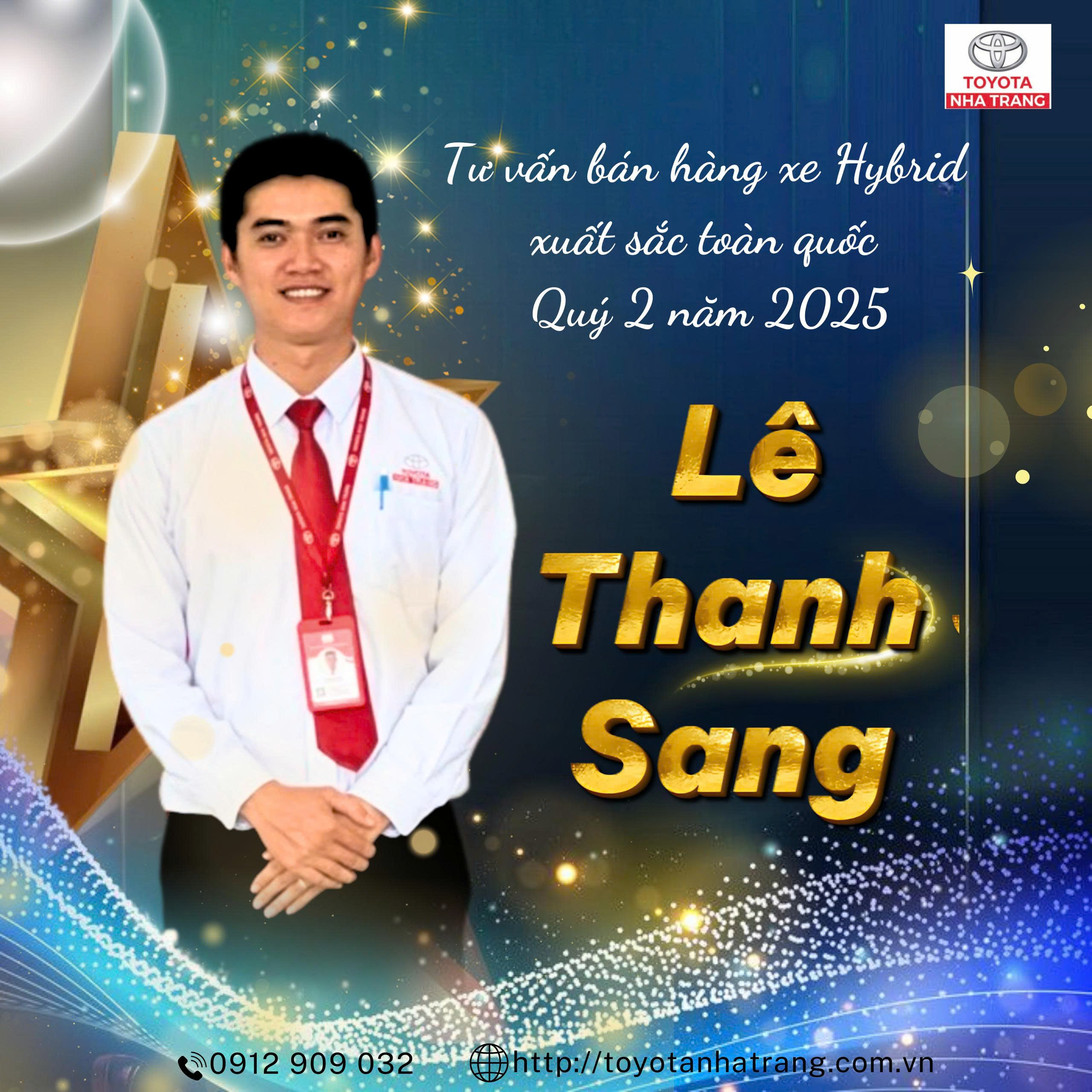 Toyota Nha Trang xin chúc mừng Mr. Lê Thanh Sang – Tư vấn bán hàng đã vinh dự đạt danh hiệu: TƯ VẤN BÁN HÀNG XE HYBRID XUẤT SẮC TOÀN QUỐC Quý 2 năm 2025