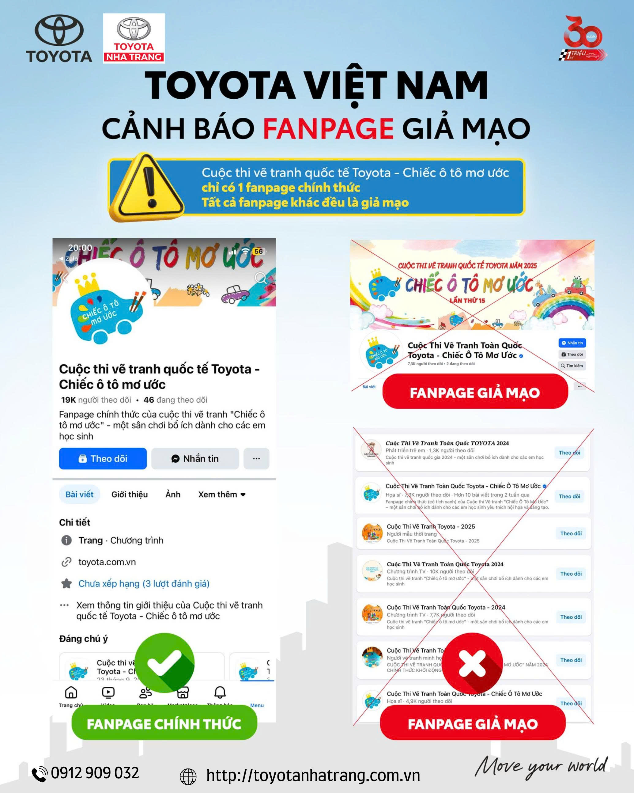 Trong thời gian gần đây, trên mạng xã hội xuất hiện một số fanpage giả mạo, tự ý sử dụng thông tin và hình ảnh của “Cuộc thi vẽ tranh Quốc tế Toyota – Chiếc ô tô mơ ước” – chương trình thường niên do Toyota Việt Nam phối hợp cùng Báo Thiếu niên Tiền phong và Nhi đồng tổ chức. Đáng chú ý, một số fanpage này còn có dấu tick xanh, dễ khiến phụ huynh và học sinh hiểu lầm là kênh chính thức.